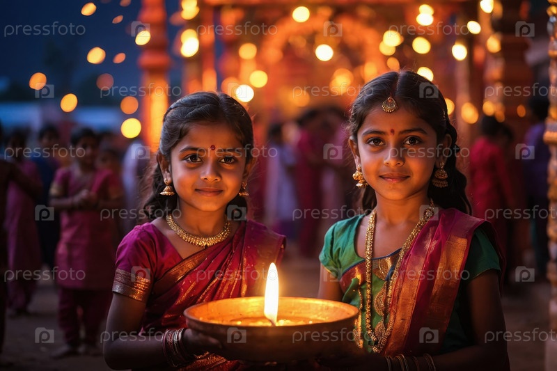 Молодые индийские дети сфотографированы в традиционной одежде на фоне фестиваля Дивали