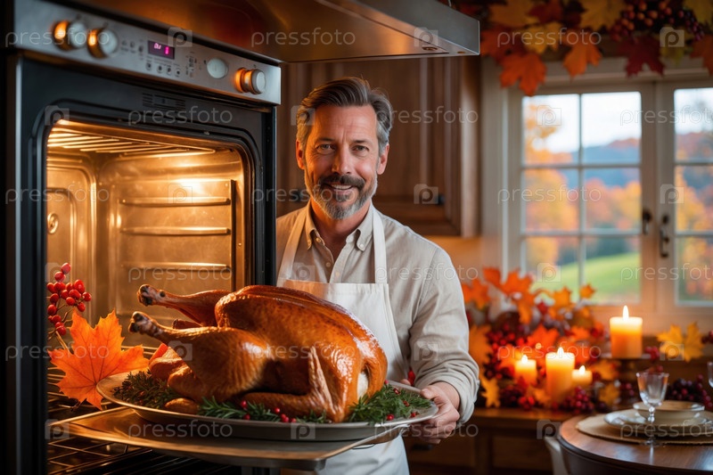 AI Generative Человек шеф-повар готовит жареную индейку на День благодарения в кухне