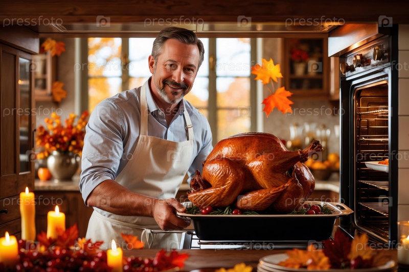 AI Generative Человек шеф-повар готовит жареную индейку на День благодарения в кухне