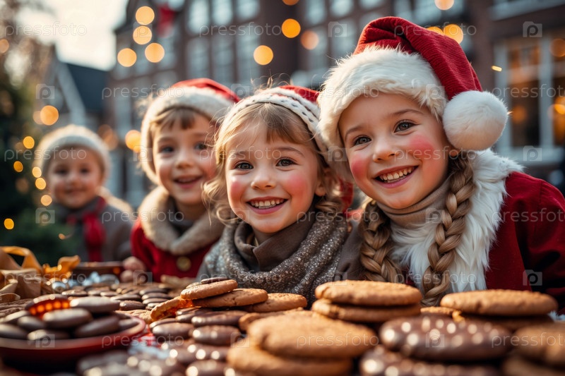 Маленькие дети в красных шляпах Санты сидят за праздничным столом на День Святого Николая с печеньем