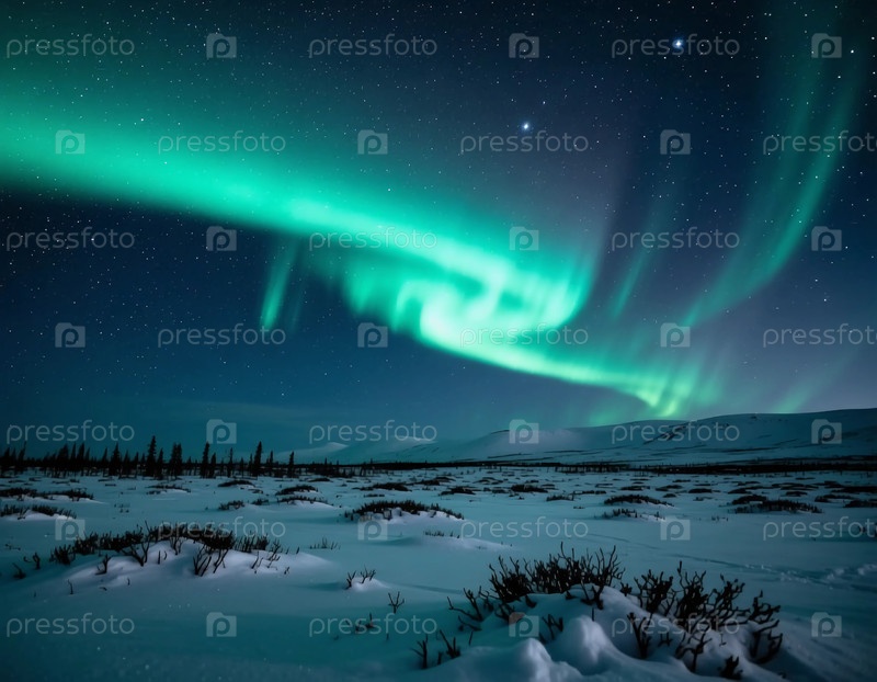 Яркое северное сияние танцует по ночному небу над заснеженной тундрой, создавая волшебную атмосферу праздника, идеально подходящую для рождественских и новогодних торжеств