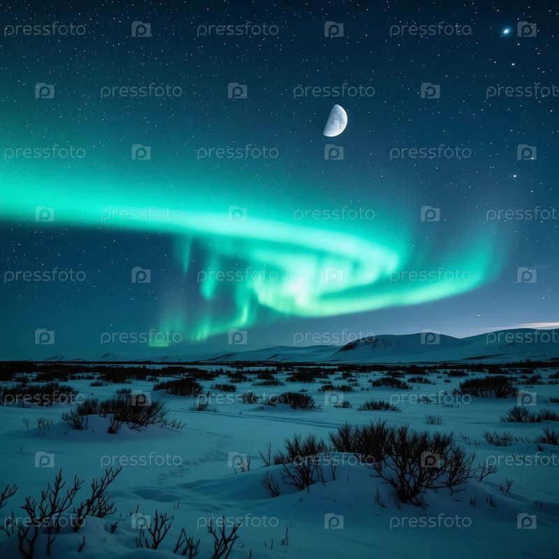 Ослепительное северное сияние освещает тундру в звездную ночь, создавая волшебную атмосферу во время рождественских и новогодних праздников