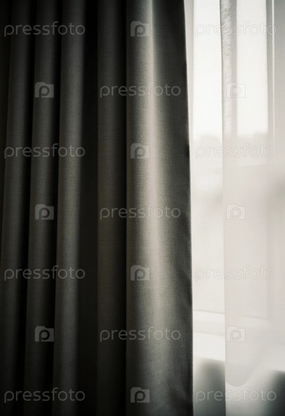 Мягкие черные шторы придают комнате элегантность, а чистая ткань позволяет проникать нежному свету, создавая спокойную и привлекательную атмосферу в течение дня