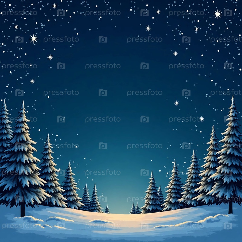 Под навесом мерцающих звезд тихий зимний лес покрыт снегом, предлагая спокойную обстановку, идеально подходящую для праздничных торжеств и новогодних мероприятий