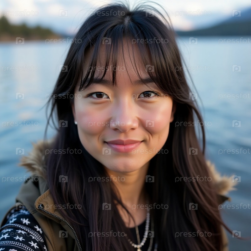 Яркая пожилая аляскинская индейка стоит у воды, ее нежная улыбка отражает радость и мудрость