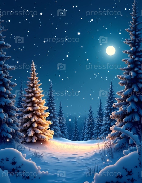 Спокойный лес со снежными деревьями светит в лунном свете, а звезды мерцают на ясном ночном небе, создавая волшебную зимнюю сцену для праздничных торжеств