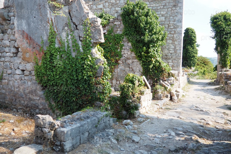 Руины Стари Бар демонстрируют остатки древней архитектуры с поднимающимися лозами и асфальтированной тропой, приглашая вас исследовать исторический старый город