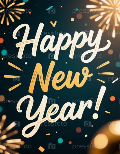 Яркие фейерверки и праздничные цвета окружают счастливые слова, желающие всем счастья в новом году