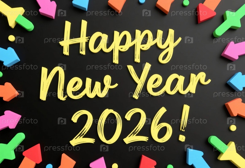 Яркие цвета окружают радостное послание, желающее всем счастливого Нового года в 2026 году.Праздничные стрелы и формы создают оживленную атмосферу, идеально подходящую для празднований и приветствий генеративного ИИ