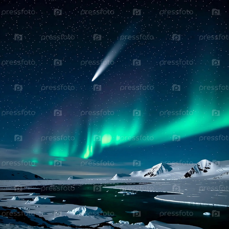 Впечатляющие северные огни освещают темное небо над снежной тундрой, когда яркая комета проносится по ночи, создавая волшебную расслабляющую атмосферу в арктическом пейзаже