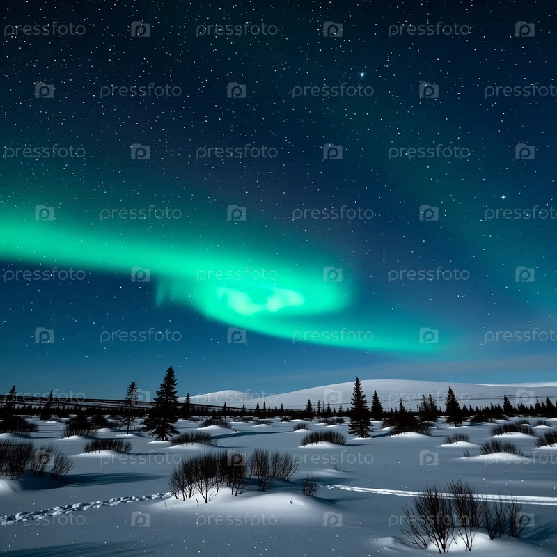Яркие цвета северного сияния танцуют в ясном ночном небе над безмятежной тундрой, покрытой снегом. сосны и снегопады создают мирную атмосферу отдыха Generative AI