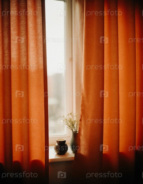 Солнечный свет проникает в уютную комнату через ярко-красные шторы, бросая теплое свечение на небольшой подоконник, украшенный вазой и растением