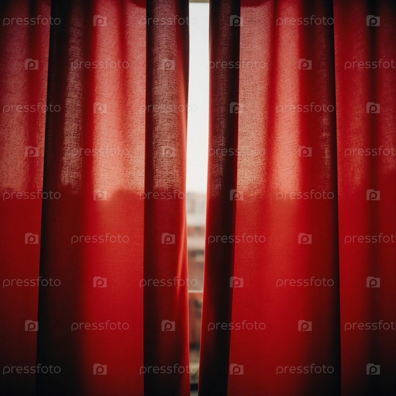 Ярко-красные шторы частично открываются, впуская мягкий утренний свет.Сцена снаружи намекает на жизнь за пределами ткани, создавая теплую атмосферу