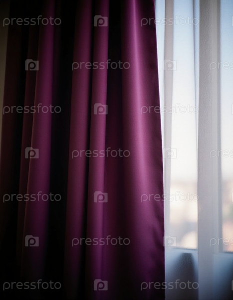 Элегантные фиолетовые лиловые шторы висят у окна, позволяя мягкому естественному свету проникать в комнату, создавая спокойную и привлекательную атмосферу на протяжении всего дня