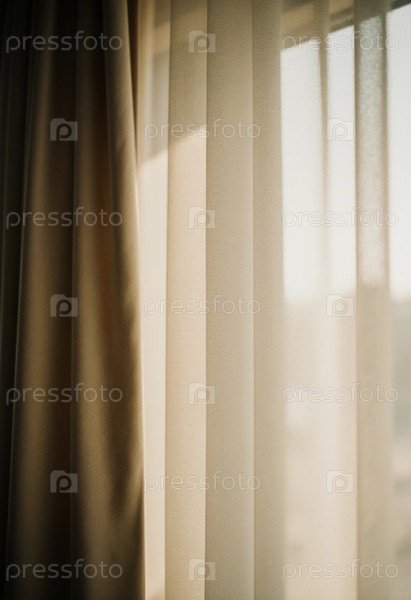 Естественный свет мягко фильтруется через элегантные коричневые шторы, создавая теплую и привлекательную атмосферу в спокойной утренней обстановке