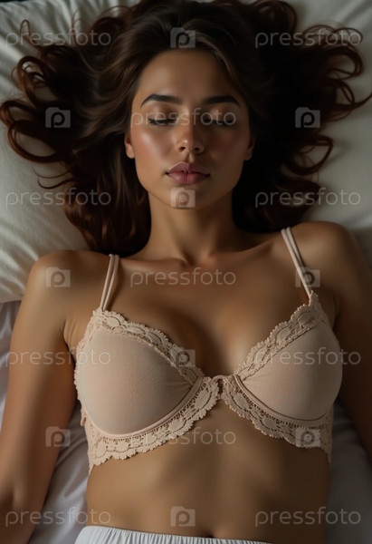 В тихой спальне женщина лежит на спине с закрытыми глазами, одета в хрупкое белье.Ее расслабленное поведение отражает сущность комфорта и спокойствия во время покоя