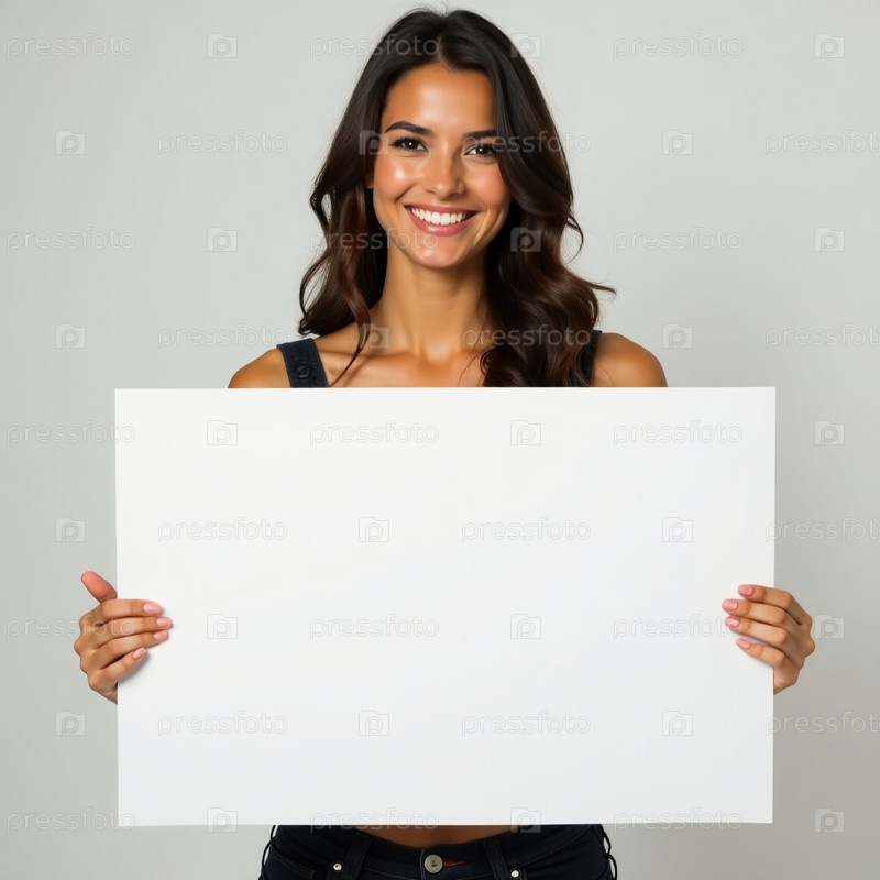 Веселая женщина уверенно держит пустой плакат в хорошо освещенной студии и излучает позитив, приглашая зрителей представить себе бесконечные творческие возможности для своего холста Generative AI