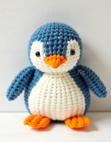 Эта очаровательная игрушка пингвина - это ручное творение с ярко-синей и белой нитью с яркими апельсиновыми акцентами, идеально подходит для добавления обаяния к любому детскому саду или подарку генеративного ИИ