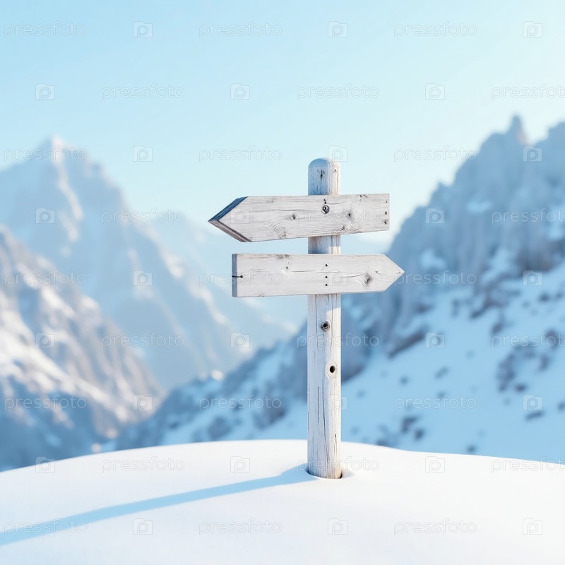 Проветрившийся указатель стоит среди свежего снега, направляя исследователей к Снежной горе на севере, с высокими горами, простирающимися над горизонтом под ярко-синим небом