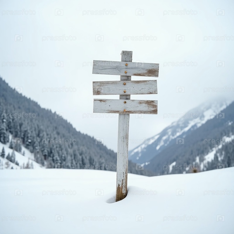 Из покрытия белого снега возникает выветрившийся деревянный знак, указывающий на Снежную гору на севере, окруженную высокими ледяными деревьями под облачным небом