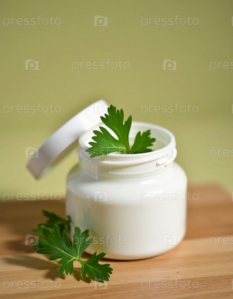 Консервная банка крема усилена свежими листьями петрушки, демонстрируя яркий зеленый цвет на мягком фоне генеративного ИИ