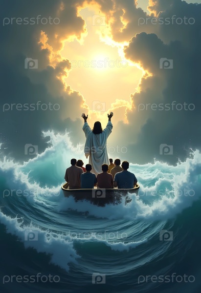 Спокойный момент разворачивается, когда Иисус уверенно стоит на лодке и держит руки высоко среди мягких волн.Мягкий свет проникает сквозь темные облака, освещая сцену надеждой генеративного ИИ
