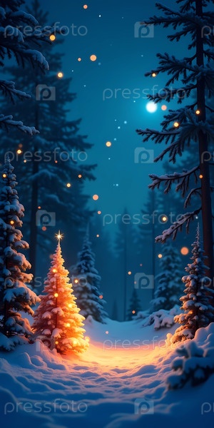 Спокойный лес, окутанный сумерками, с светящейся рождественской елкой среди заснеженных сосен, создает уютную атмосферу, идеально подходящую для праздничных размышлений и торжеств генеративного ИИ