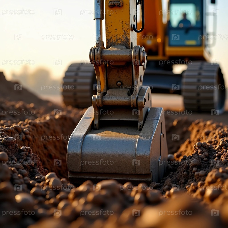 Тяжелая техника усердно работает, когда ведро экскаватора проникает в мягкую землю, создавая траншею на рассвете на спокойной строительной площадке вокруг природы