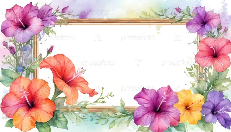 Цветные цветы гибискуса и петунии создают яркую карту, идеально подходящую для дней рождения, свадьб и специальных случаев с пустым пространством для личных сообщений