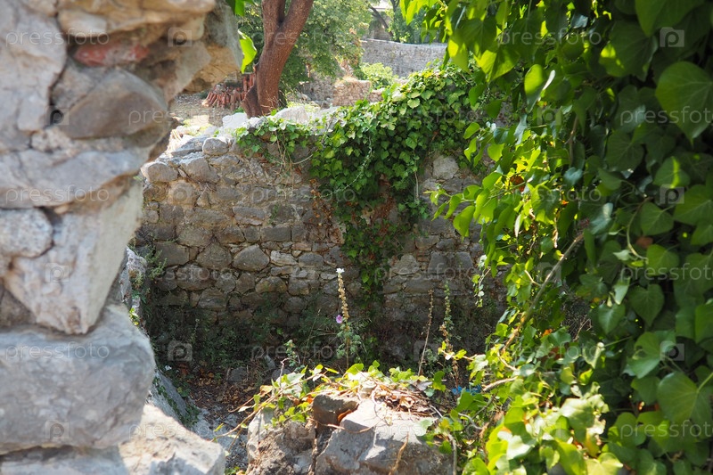 Остатки Старого Бара показывают старые каменные стены, окутанные яркой зеленью, отражающие богатую историю и архитектурную красоту старого города Черногории