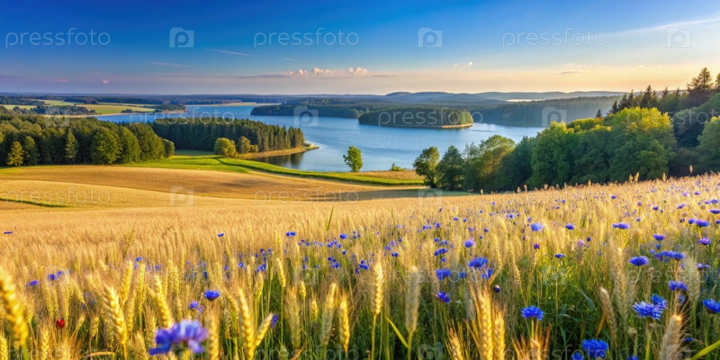 Спокойный летний пейзаж с голубыми цветами и озером Серена