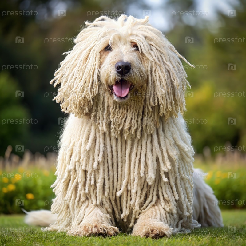 Красивая собака Комондор сидит на траве с цветами в фоне