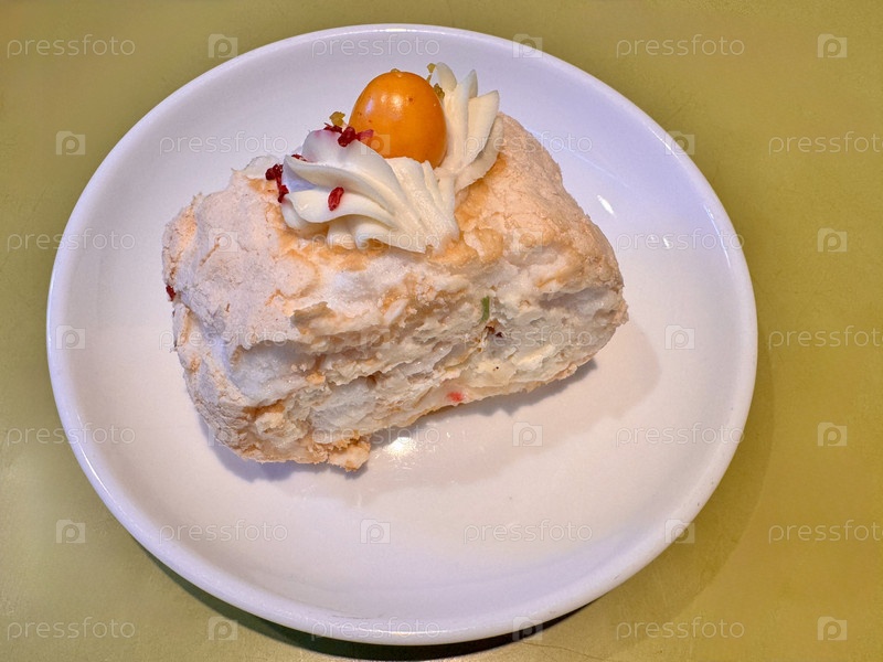 Сочный и вкусный десерт рулон с меренгом, украшенный фессалисами на белой фарфоровой тарелке