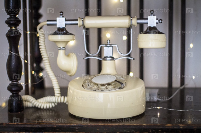 винтажный кремовый телефон с двумя трубками на деревянном столе