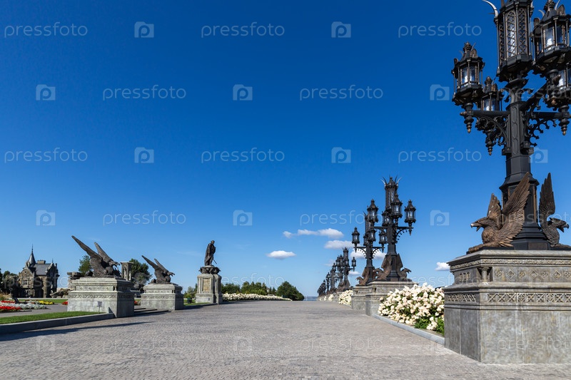 Ряд открытых фонариков украшены скульптурами грифонов в туристическом комплексе замка Гарибальди. деревня Хрящевка, Самаринская область, Россия