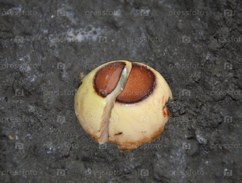 Прорастающее семя авокадо сажают в землю. Семя лежит в земле, и из него прорастает будущее дерево. Забота об окружающей среде. Выращивание экзотических деревьев