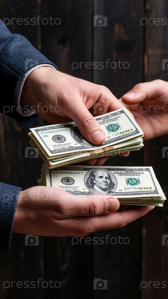 Пакеты денег в руках мужчин, переводящие деньги из рук в руки
