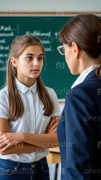 Учитель разговаривает с девочкой в классе, на фоне доски