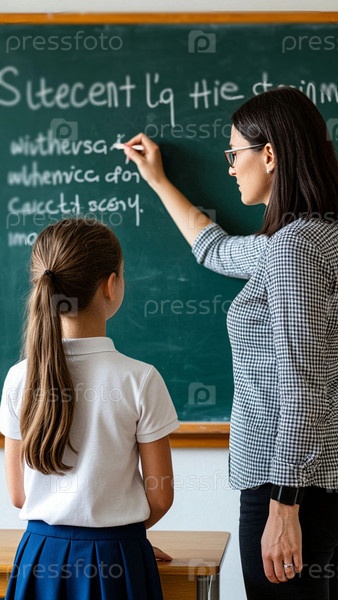 Учитель пишет мелом на доске, ученик стоит рядом с