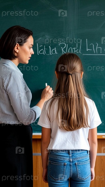 Учитель пишет мелом на доске, объясняет задание учителю