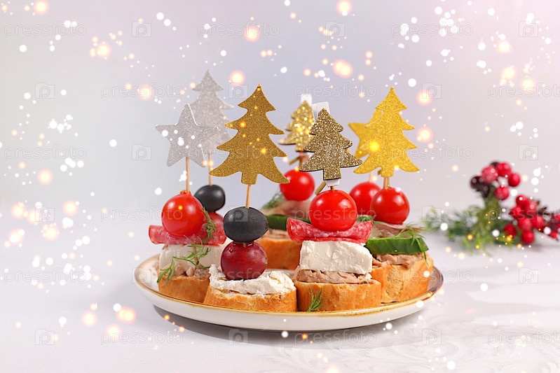 Ассортимент различных каннапе с помидорами, паштетом, сыром моцареллой, салями, сельдью, оливками и виноградом на мраморном столе. рождественские и новогодние блюда, комплект закусок для праздничного стола