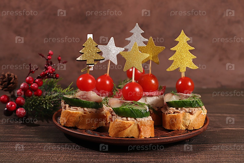 Рождественские и новогодние блюда, набор закусок для праздничного стола. канапы с помидорами, паштетом, огурцом, сельдью, томатами и укропом, концепция канун Рождества