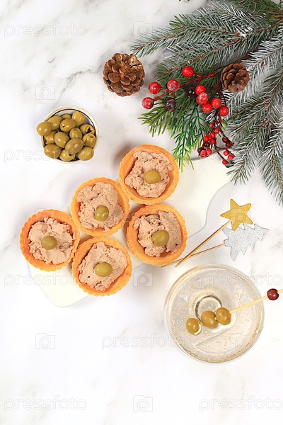 Поднос с пирогами с паштетом, сыром и оливками на бетонном столе, концепция канун Рождества. рождественские и новогодние блюда, выбор закусок и лакомств для праздничного стола