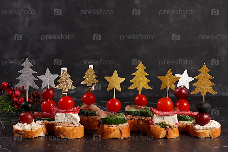 Ассортимент различных каннапе с помидорами, паштетом, сыром моцареллой, салями, сельдью, оливками и виноградом на мраморном столе. рождественские и новогодние блюда, комплект закусок для праздничного стола
