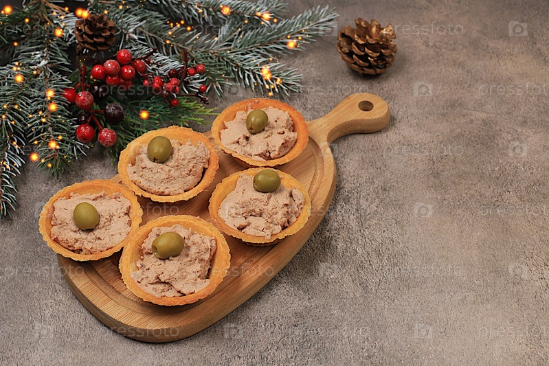 Поднос с пирогами с паштетом, сыром и оливками на бетонном столе, концепция канун Рождества. рождественские и новогодние блюда, выбор закусок и лакомств для праздничного стола