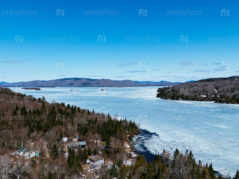 Вид с воздуха извилистой дороги вдоль замерзшего озера в Квебеке с лесом и горами под синим небом