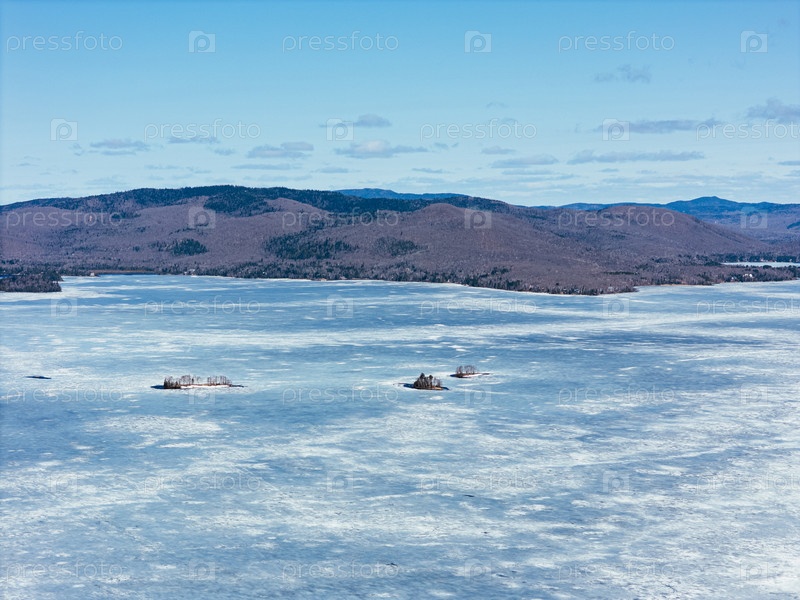 Вид с воздуха извилистой дороги вдоль замерзшего озера в Квебеке с лесом и горами под синим небом