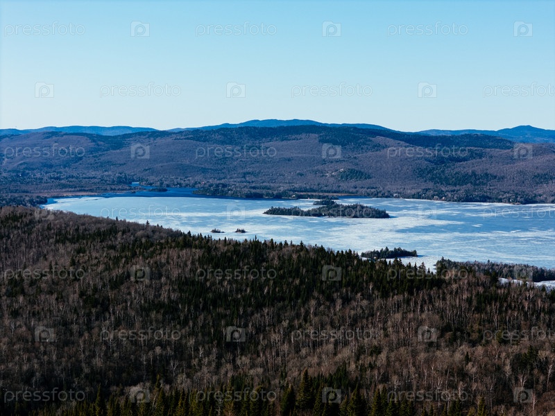 Вид с воздуха извилистой дороги вдоль замерзшего озера в Квебеке с лесом и горами под синим небом
