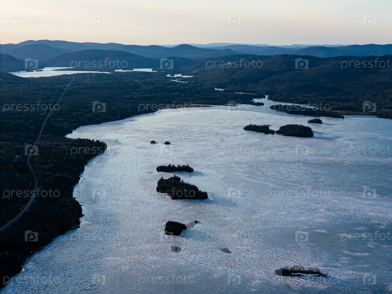 Вид с воздуха извилистой дороги вдоль замерзшего озера в Квебеке с лесом и горами под синим небом
