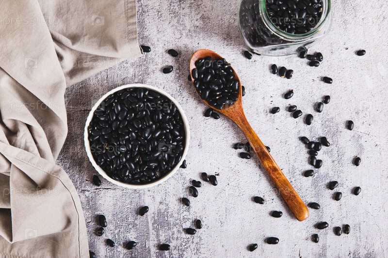 Сырые черные бобы в миске и в ложке вид сверху стола